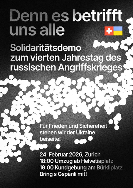 Différents événements auront lieu en Suisse pour les 1 an du conflit. Un rassemblement aura lieu le 24 février à 18h00 à Lausanne, nous vous invitons également à une soirée de solidarité le même jour à Genève, ainsi qu’à une manifestation à Bellinzone et à un rassemblement à Neuchâtel. Le samedi 25 février, une manifestation est organisée à Genève à 15h00.